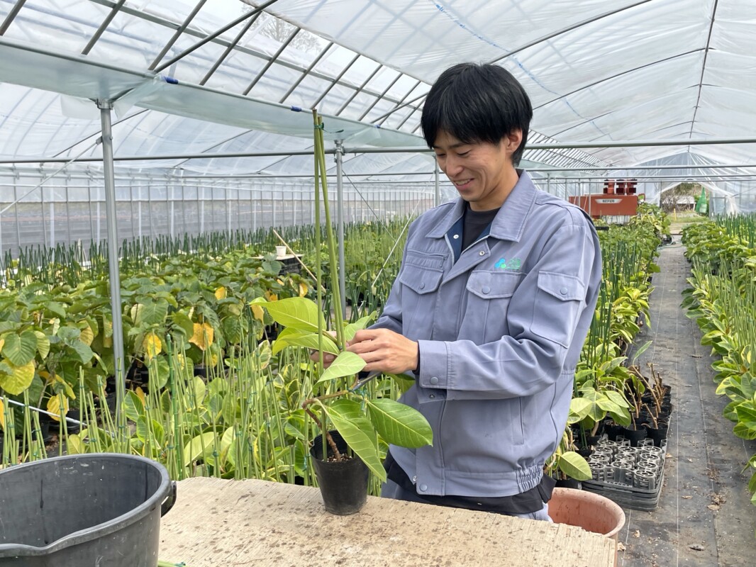 今回は、入社2年目の吉田さんにお話を伺いました。「元々植物が好きで、休みの日も観葉植物のショップを巡る」と話す吉田さん。琴花園入社前は、フラワーショップで花きを販売する仕事に励まれていましたが、生産の仕事をやってみたいと転職。
